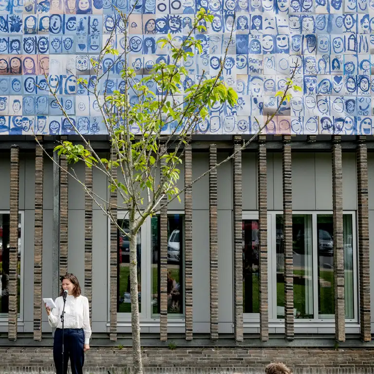 SMK-direktør Astrid la Cour holdt tale, da det store, fælles kunstværk blev hængt op på Musikskolens facade. Værket hænger der sommeren over. Foto: Mette Johnsen.